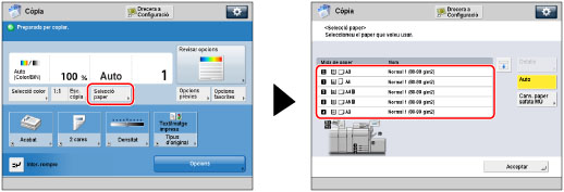 Si [Selecció auto de calaix basada en color] s'ha establert a [Opcions de funcions] (Configuració), es pot portar a terme la selecció automàtica de paper d'acord amb el mode de color seleccionat quan copieu. (Vegeu "Especificació de la Selecció automàtica de calaix de paper en funció del color.")