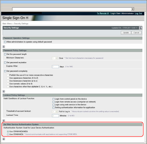 In SSO-H, you can set the Local Device Authentication system that the Web service authentication system provides. By rejecting communication with applications which do not support CRAM-MD5, you can enhance the security.