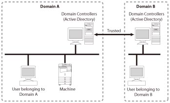 Users belonging to Domain A (which includes the machine), and users belonging to Domain B (which is bi-directionally trusted by Domain A), can be authenticated, and users registered in the machine itself can be authenticated. The user selects the location to log in to (domain name or [This device]) when logging in.