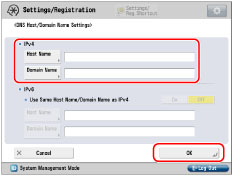 Press [DNS Host/Domain Name Settings] for [DNS Settings] → specify the following items in <IPv4> → press [OK].