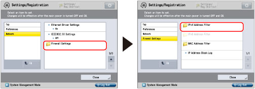 Press [Firewall Settings] for [Network] → [IPv4 Address Filter].