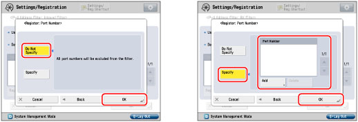 To specify port number individually: Press [Specify] → press [Add] and enter port number → press [OK].