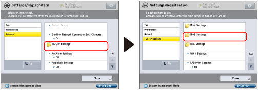 This section describes the procedure for setting TCP/IPv6 using the control panel. After specifying the settings for TCP/IPv6, follow the procedure in "Settings Common to TCP/IPv4 and TCP/IPv6" to specify the required settings, and the procedure in "Confirming TCP/IPv6 Settings (PING Command)" to check whether the network settings are correct. If the settings for TCP/IPv4 are already specified and you have finished specifying the settings common to TCP/IPv4 and TCP/IPv6, only check the network settings after completing this procedure.