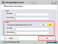 If you set <Use Same Host Name/Domain Name as IPv4> to 'Off', press [Host Name] → enter the name of the machine → press [OK]. Press [Domain Name] → enter the name of the network domain the machine belongs to → press [OK].