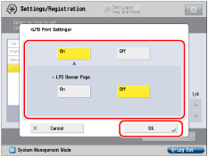 Output of a banner page is set on a print-job basis. Even if [On] is selected for <LPD Banner Page>, a banner page cannot be output for a print job unless it is set.