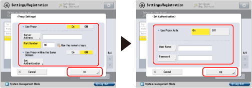 If you want to use proxy authentication, press [Set Authentication] → press [On] for <Use Proxy Auth.>. Press [User Name] → enter the user name to use for proxy authentication → press [OK]. Press [Password] → enter the password to use for proxy authentication → press [OK]. On the Confirm screen, enter the same password to confirm the password → press [OK].