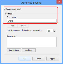 In the Active Directory environment, the procedures for specifying the security settings of the shared folder differ from above. For more information, see the Windows manual.