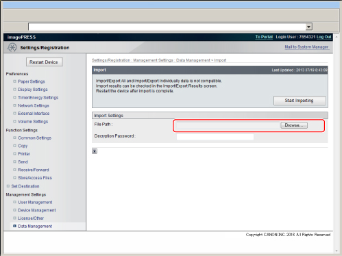 If you import the Department ID Management Settings when using Import All function, system manager information settings such as an ID or password are overwritten. Check the system manager information of the machine for exporting before using Exporti All function, as it is required when logging in to the destination machine for importing.