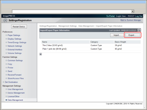 Click [Settings/Registration] → select [Data Management] for <Management Settings>.