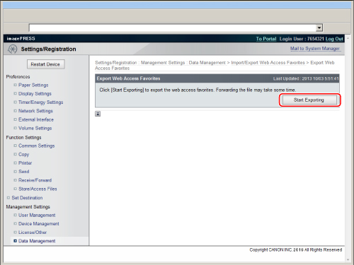 Click [Settings/Registration] → select [Data Management] for <Management Settings>.