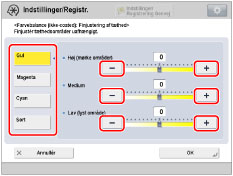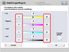 Tryk på [-] eller [+] for at justere farvestyrken for hver farve.