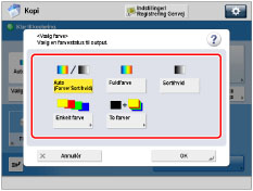 Hvis [Brug Auto (Farve/Sort/hvid)] i [Vælg farveindstillinger til kopi] er indstillet til 'Fra', vises [Auto (Farve/Sort/hvid)] ikke. (Se "Begrænsning af brug af auto-farvevalg.")