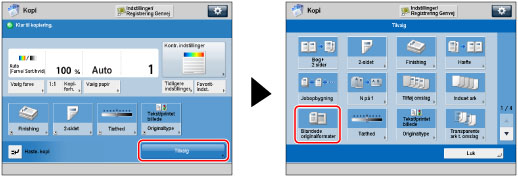 2-sidet] sammen med [Blandede originalform.], bliver kopierne lavet som 1-sidede kopier på papir, der svarer til deres formater. |