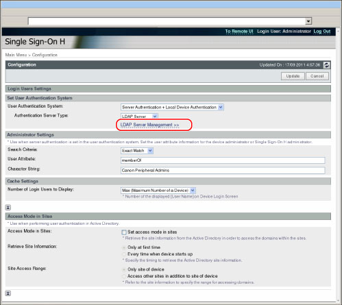 You can click [LDAP Server Management] only if you select [Server Authentication + Local Device Authentication] for [User Authentication System] and [LDAP Server] for [Authentication Server Type].