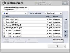 Du kan sortere listen med papirtyper efter registreringsdato (Reg. (Stigende)/Reg. (Faldende)), navn (Navn (Stigende)/Navn (Faldende)) eller basisvægt (Vægt (Stignde)/Vægt (Faldnde)) med dropdown-listen Sortér liste.