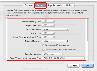 Click [Driver] or [Options] → configure the options installed in the printer.