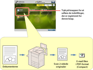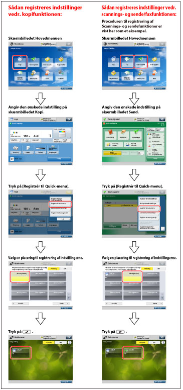 For instruktioner om at gemme en Personlig knap/Delt-knap kan du se forklaringen til brug af Scan og send-funktionen som eksempel i "Registrering af en Personlig-knap/Delt-knap."