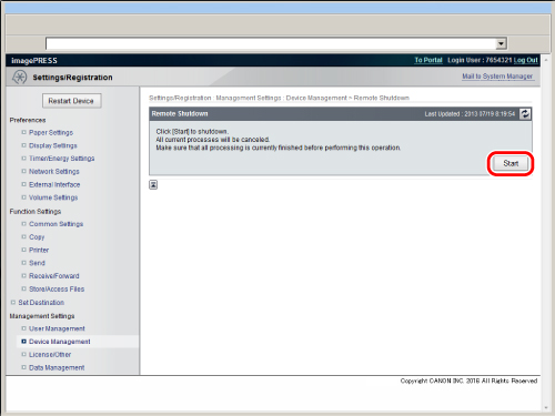 When the machine is shut down, all jobs currently underway are canceled. Make sure that all jobs are complete before shutting down the machine. |