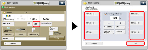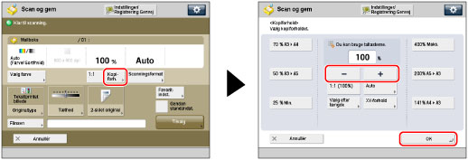 Tryk på [Kopiforhold] → tilpas zoomforholdet med [-] og +[] → tryk på [OK].
