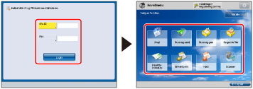 Administrerer du maskinen med kontrolkort, og er der en funktion med grænsen sat til 'Fra' i [Begræns funktioner], vises hovedmenuen, når maskinen starter. I dette tilfælde skal du udføre proceduren fra trin 1 uden atindsætte kontrolkortet.