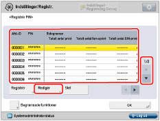 for at få vist den afdeling, hvis PIN-kode du ønsker at ændre → vælg afdelingen → tryk på [Redigér].