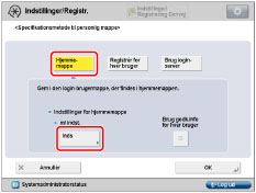 Du kan anvende op til 255 tegn til stien for den personlige mappe. Hvis stien, der indeholder mappestien (op til 222 tegn), en omvendt skråstreg og mappenavnet for loginbrugernavnet (op til 128 tegn), overstiger 255 tegn, kan du ikke indstille mappen som den personlige mappe.