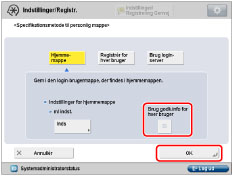 Du kan anvende personlige mapper uden at angive godkendelsesoplysninger for den enkelte bruger, når betingelserne herunder er opfyldt. I dette tilfælde skal du fravælge [Brug godk.info for hver bruger].