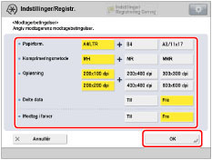 Angiv modtagerbetingelserne i henhold til specifikationerne på modtagerens maskine. Der kan opstå en fejl i afsendelsen, hvis du angiver betingelser, som modtagerens maskine ikke understøtter.