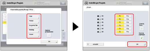 Hvis du indstiller til 'Til', anvendes indstillinger angivet i "Angivelse af Automatisk papirskuffevalg baseret på farve". Hvis du bruger forskelligt papir til farvekopiering og sort/hvid-kopiering, er de specificerede papirkilder kun tilgængelige med Automatisk papirvalg og Automatisk bakkeskift.