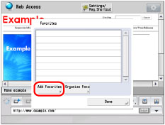 You can add frequently viewed Web pages to Favorites. Web pages registered in Favorites appear on the Main Menu screen as buttons. By adding a Web page to Favorites, you can easily access the Web page.