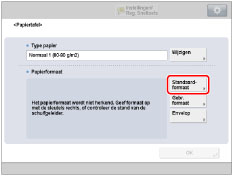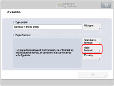 → en voer de juiste waarden in.Om een papierformaat te kunnen selecteren dat is opgeslagen onder een formaattoets ([S1] t/m [S5]), dient u vooraf het afwijkende papierformaat onder de formaattoets op te slaan. Voor instructies over het opslaan van afwijkende papierformaten raadpleegt u "Opslaan/Bewerken/Verwijderen van gebruikersformaten."