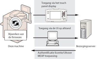 U kunt de firmware van de machine bijwerken tot de meest recente versie met "Registreer/Update software". U kunt deze functie zowel via het touch panel display als via de computer gebruiken (externe UI).