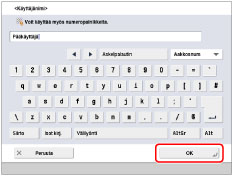 Kun käytät SSO-H:n Active Directoryn käyttäjäautentikointijärjestelmää (mukaanlukien Active Directory autentikoinnin Active Directory autentikointi + Paikallislaiteautentikoinnin käyttäjäautentikointijärjestelmällä), voit käyttää vain aakkosnumeerisia merkkejä,- (tavuviiva), _ (alleviivaus), ` (heittomerkki), { } (sulkeet), ~ (aaltoviiva), ! . (huutomerkki), # (numero), $ (dollari), % (prosentti), & (et-merkki), ' (lainausmerkki), ( ) (kaarisulkeet), @ (at-merkki) ja ^ (caret). Voit kirjautua vain käyttämällä oikeita merkkejä. (Huomioi suuraakkoset)