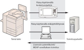 Jos haluat laajentaa laitteen toimintoja käyttämättä järjestelmän lisäasetuksia, asenna MEAP-sovelluksia. Lisätietoja MEAP-sovelluksista, katso