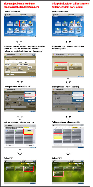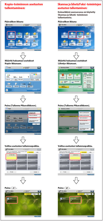 Ohjeet Henkilökohtaisen painikkeen/Jaetun painikkeen tallentamiseksi, katso selostusta käyttäen esimerkkinä Skannaa ja lähetä -toimintoa kohdassa "Henkilökohtaisen/Julkisen painikkeen tallentaminen."