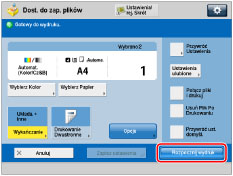 W przypadku konieczności wydrukowania (za pomocą komputera) pliku zapisanego w urządzeniu, lub w czasie korzystania z funkcji [Zapisz w Skrytce pocztowej] znajdującej się na ekranie Kopiowanie, z zachowaniem zapisanych wraz z plikiem ustawień, nie należy drukować pliku z ekranu Zmiany ustawień drukowania.W przypadku drukowania pliku z ekranu Zmiany ustawień drukowania, plik może zostać wydrukowany z pominięciem ustawień drukowania zapisanych dla tego pliku.