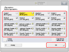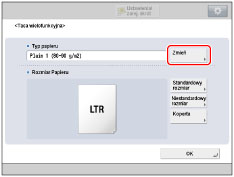 Użytkownik może rejestrować rodzaje papieru, które nie są wyświetlane na liście szczegółowych ustawień opcji Wybierania rodzaju papieru.Aby uzyskać więcej informacji na temat rejestrowania niestandardowych rodzajów papieru, patrz "Rejestrowanie niestandardowych rodzajów papieru."