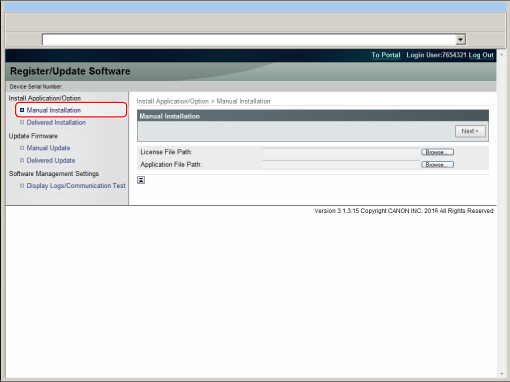 Jeżeli do aplikacji MEAP nie dołączono Kodu dostępowego licencji, plik licencji zostanie przesłany przez dostawcę aplikacji MEAP.Klucz licencji oraz plik licencji opisany w niniejszej sekcji nie są wymagane.Aby uzyskać więcej informacji, zapoznaj się z instrukcją obsługi danej aplikacji MEAP.