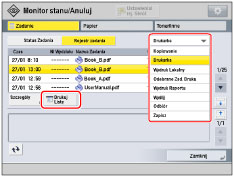 Wciśnij przycisk rozwijalnej listy → wybierz rodzaj zadania do drukowania → wciśnij przycisk [Drukuj listę].