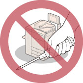 We wnętrzu znajdują się części, w których wytwarzane jest wysokie napięcie oraz powstaje wysoka temperatura.Podczas wykonywania przeglądów wnętrza urządzenia należy zachowywać odpowiednie środki ostrożności.Nie należy przeprowadzać żadnych przeglądów, które nie zostały opisane instrukcjach obsługi urządzenia.