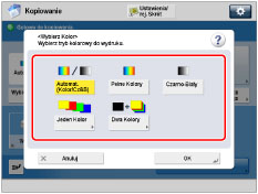 Dla każdej z funkcji Kopiowania domyślnym ustawieniem jest Automatyczny wybór koloru (Kolor/Czarno-biały).