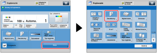 Dwustronny] należy postępować zgodnie z instrukcjami wyświetlanymi na ekranie, aby zeskanować poszczególne strony oryginałów.Jeżeli chcesz umieścić dwustronnych oryginał na szklanej płycie roboczej celem kopiowania z wykorzystaniem funkcji [Dwustronny