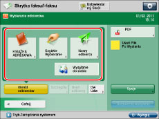 Jeżeli rodzaj adresu zostanie włączony w [Ogranicz nowych odbiorców], nie można wprowadzać nowych odbiorców tego rodzaju.Wybierz zapisanego odbiorcę za pomocą Lokalnej książki adresowej, Zdalnej książki adresowej, Serwera LDAP w [Książka Adresowa] lub za pomocą klawisza wybierania jednoprzyciskowego w [Wybieranie jednoprzyciskowe].(Patrz "Ograniczanie funkcji wysyłania.")