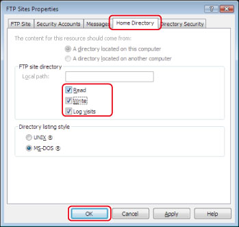 Click the [Home Directory] tab → select both [Read] and [Write] → click [OK].