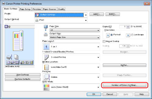 If [Number of Colors Settings] is not displayed, in the [Device Settings] tab, set the function version of the printer (see "Setting the Printer Options").
