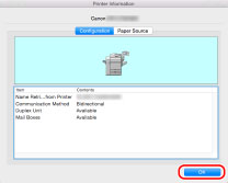 If the printer driver name displayed at the top of the [Printer Information] dialog box and the printer name displayed as [Name Retrieved from Printer] do not correspond correctly, you may not be able to use the printer functions correctly. If the names do not correspond, delete the printer you have added in [System Preferences] and add it again. For details, see the Printer Driver Guide (see " Installation").