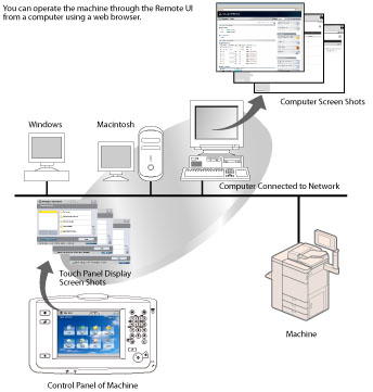 The Remote UI (User Interface) is the preinstalled software in the machine that enables you to access the machine's functions by using a web browser. For example, the Remote UI enables you to access the machine to check job status, execute jobs, and specify various settings. To be able to use the Remote UI, all you need is a web browser and a network connection between your computer and the machine.