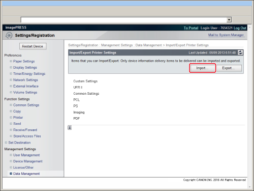 After importing device settings, the Remote UI cannot be used to perform other operations until the machine is restarted. Turn OFF the main power of the machine, and turn the main power back ON again.