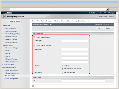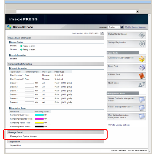 If you select [Display on Portal], the message board is displayed on the portal page of the Remote UI.
