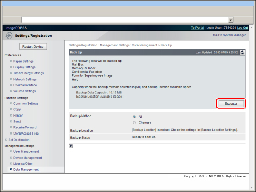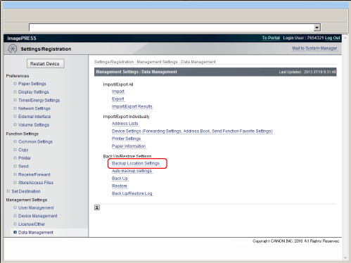 If you want to display the backup/restore log, click [Settings/Registration] → [Data Management] → [Back Up/Restore Log].